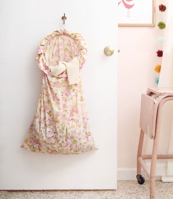 Стандартная бельевая корзина занимает немало места в ванной, а если площадь ограничена, то это очень заметно. В этом случает её разумнее заменить текстильным мешком, который легко закрепить на стене.