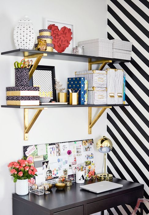 Иногда, чтобы сделать интерьер стильным, достаточно добавить всего несколько деталей. Например, разбавить тёмную мебель домашнего офиса вкраплениями золота. На полочки поставить декорированные коробки для хранения мелочей.