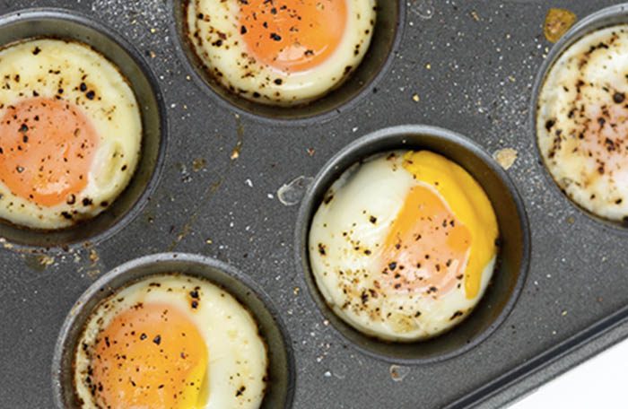 Смажьте формочки для кексов маслом, добавьте столовую ложку воды в каждую. Разбейте яйцо в каждую форму и отправьте в духовку на 13 минут при температуре 180 градусов.