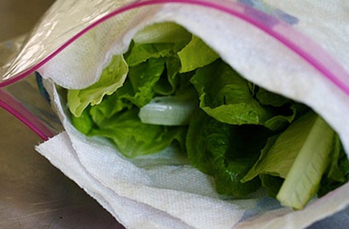 Вымойте листья салата и разложите их на бумажном полотенце. Сверните его в рулон и засуньте в целлофановый пакетик с зип-застежкой. Отправьте пакет в холодильник.