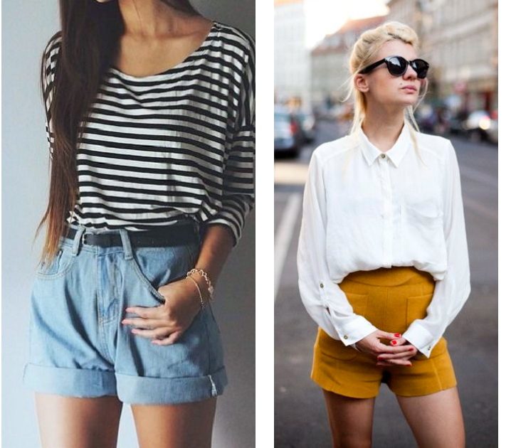 Оптимальный вариант – модель выше колена, но не чрезмерно короткая. В этом случае шорты не должны быть облегающими. Женщинам с фигурой подростка, чьи плечи чуть шире бедер, такие шорты с высокой талией пойдут идеально. Девушкам с модельной внешностью, как известно, идет все, они смело могут выбирать такую одежду. Ну а теперь поговорим о том, с чем и когда лучше носить эту модель.
