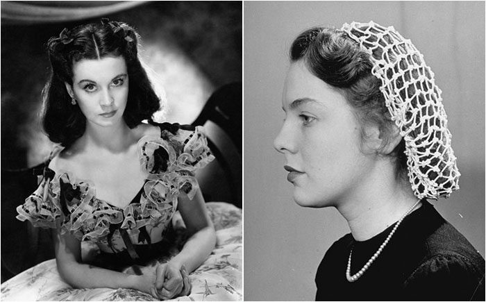 17. 1941 год. Сеточка на волосах. Такие практичные сеточки вошли в моду благодаря работницам фабрик, которые по технике безопасности должны были убирать волосы с шеи.