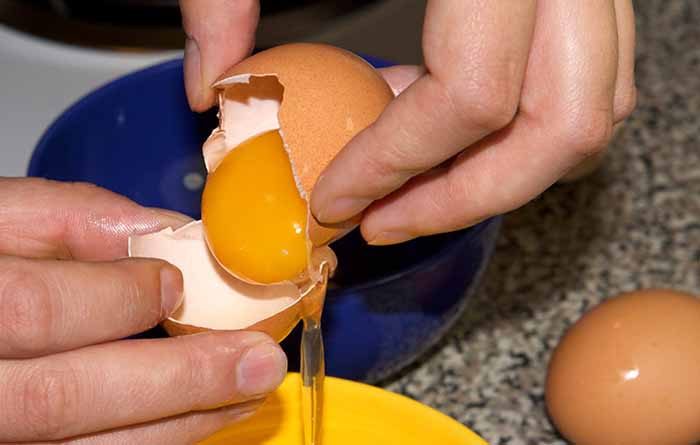 Во многих рецептах требуются отдельно желтки и отдельно белки. Одним из самых простых способов является тот, когда, разбив пополам яйцо, переливается желток из одной половинки скорлупы в другую. В это время белок свободно стекает в отдельную посуду. Белки пригодятся для приготовления французской меренги.