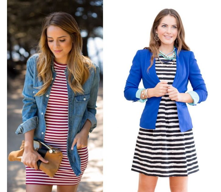 Полосатое платье в тренде и, судя по всему, надолго. Наряды морской тематики и для пижамных вечеринок, для офиса и выхода в свет. Бижутерия к такому наряду может быть всех возможных цветов. Яркими деталями образа могут стать бусы, браслеты, серьги, аксессуары из кожи, ткани, перьев и других материалов; не полосатые шейные платки, кожаные ремни и без ремней, элегантные туфли на каблуке и лоуферы.
