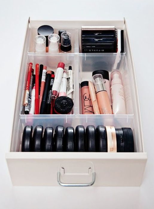 Удобно хранить косметику в выдвижном ящике, тогда она не занимает полки и зрительно не портит интерьер. Но тут возникает вопрос, как предотвратить перекатывание косметики и её смешивание при открытии или закрытии ящика? Всё очень просто, можно сделать отдельные ячейки своими руками или же купить разделители в хозяйственном магазине.
