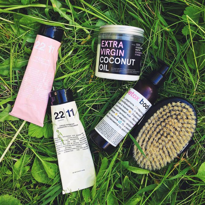 После массажа сухой щёткой — душ. Затем на ещё влажную кожу я быстро наношу кокосовое масло холодного отжима или детокс-масло для тела и иду завтракать.