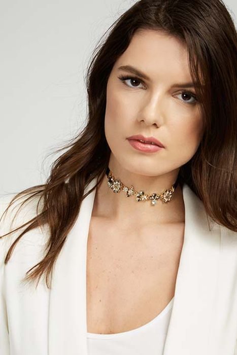 Чокер не обязательно должен быть простым по дизайну или декору. Есть и праздничные модели, которые можно надеть под деловой костюм или вечернее платье. В таком украшении присутствуют кристаллы, камни, металлы, так что в нём не стыдно выйти в свет.