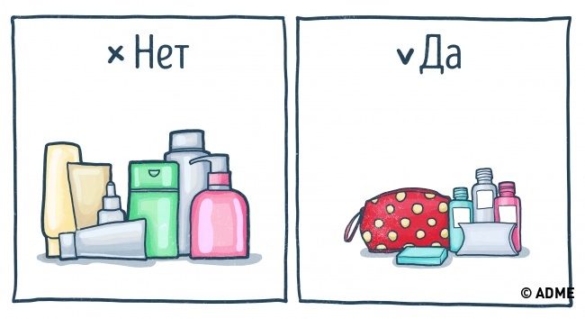Как бы ни хотелось взятьиз дома все любимые тюбики, придется пожертвовать ими ради других, более необходимых вещей. Для поездки покупаем мини-версии любимых средств.6. Правильно упаковываем мелочи
