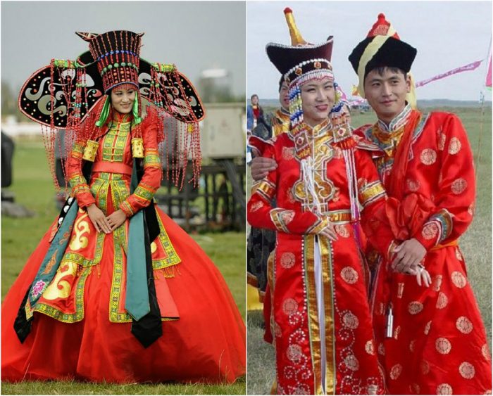 Монгольская свадьба полна традиций и ритуалов, соблюдение которых является гарантией счастливой семейной жизни. Наряд невесты в Монголии отличается изяществом и красотой, поверх платья обязательно должна присутствовать красная накидка. Еще одним атрибутом свадебного образа является сложная прическа, имитирующая коровьи рога, и небольшая шапочка, к которой крепятся многочисленные подвески — серебряные, из бусин коралла или бирюзы.