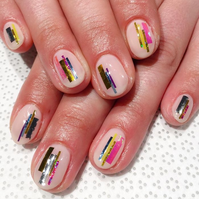 В этом году модным считается маникюр с металлическим декором. Сделать его легко при помощи тонкой разноцветной фольги. Можно использовать специальные слайдеры или посадить на лак нейтрального цвета тонкие полоски декоративной фольги.