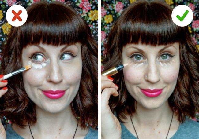 Чтобы спрятать признаки недосыпа на лице, воспользуйтесь консилером. Его наносят по направлению от внешнего уголка глаз к внутреннему, при этом захватывая только проблемную зону. Консилер нужно наносить не точками, а штрихами. Перед растушевкой косметики согрейте пальцы — так процедура будет проходить легче и качественнее.