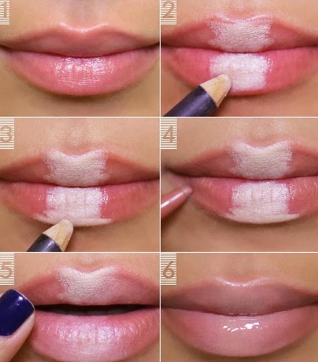 Чтобы придать губам объем, осветлите среднюю часть губ белым карандашом, а затем обведите губы карандашом под цвет помады или блеска. Подушечками пальцев растушуйте белый карандаш по центральной части губ, делая цвет более приглушенным. В конце накрасьте губы блеском.