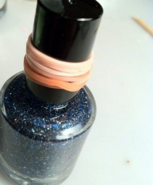 Крышка на флакончике лака для ногтей присохла намертво и не хочет откручиваться? Переверните флакончик вверх ногами и опустите крышку на пять минут в чашку с горячей водой. Далее просто оберните крышку резинкой (для лучшего сцепления) и открутите флакон.