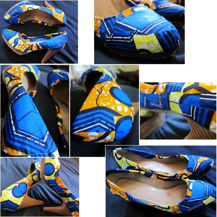 Вдохнуть новую жизнь в старые потертые туфли поможет небольшой отрезок яркой ткани. С помощью малярного скотча нужно сделать выкройку, аккуратно порезать ткань и пришить ее к ненужным туфлям.