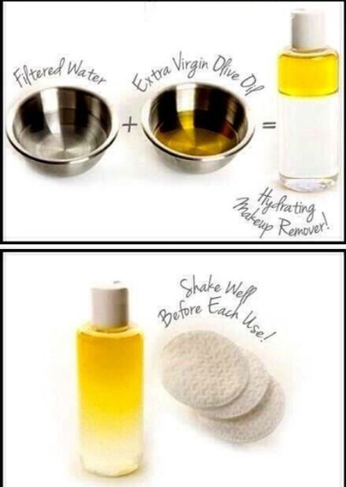 В бутылочке от старого средства для снятия макияжа смешайте равные части фильтрованной воды и оливкового масла. Перед использованием бутылочку следует хорошо встряхнуть, чтобы масло смешалось с водой и использовать, как обычное средство для снятия макияжа.