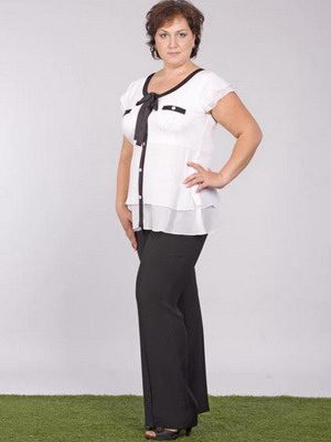 Выбирая брючные костюмы, желательно отдавать предпочтение свободным моделям брюк, при этом лучше, если пиджак будет слегка прикрывать бедра. Это также могут быть комплекты, состоящие из лосин и удлиненной блузки.
