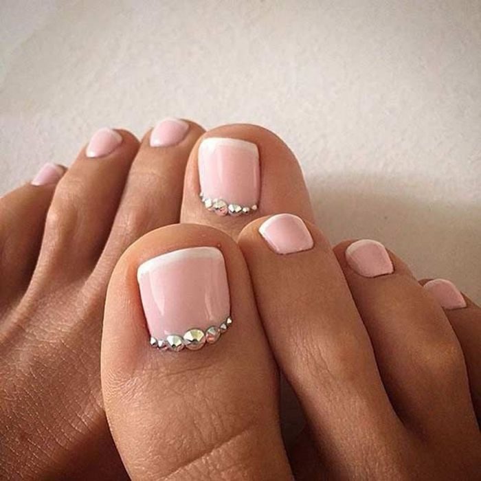Если не хочется делать слишком броский педикюр, но всё же есть желание добавить ему немного лоска, то на помощь придёт небольшой стильный акцент в виде нескольких накладных стразах. Цвет самого лака может быть нейтральным, а стразы прозрачные. Такой вариант отлично подойдёт для повседневной носки на работу.