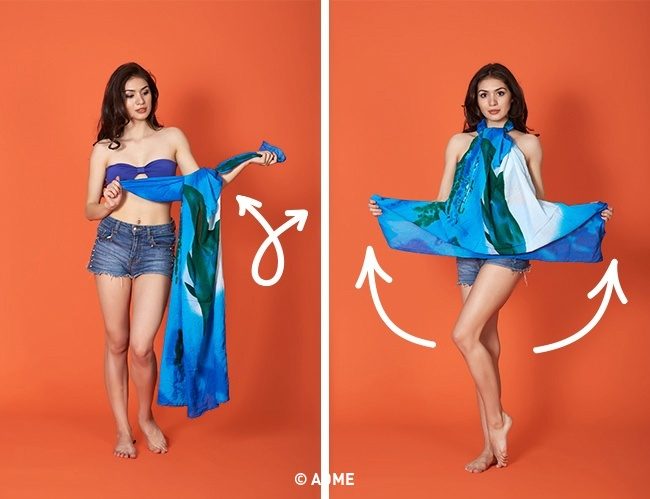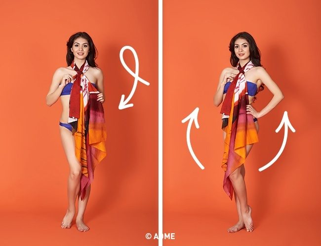 Завязываем противоположные углы парео за шеей.Другие два угла завязываем на талии за спиной.