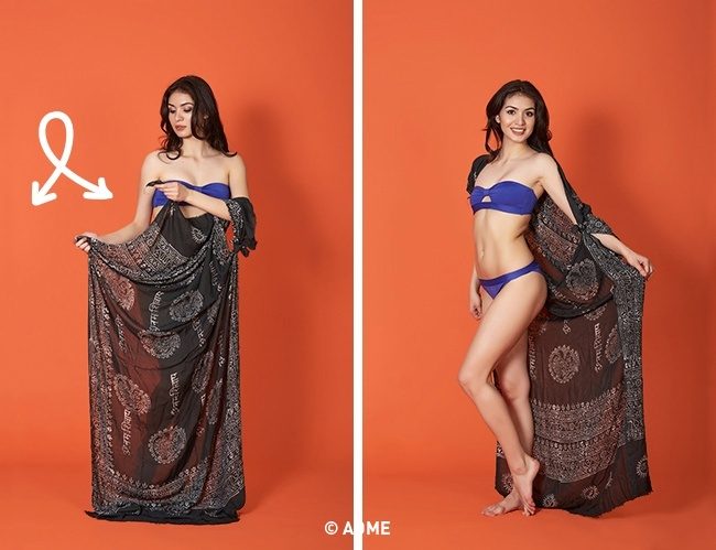 Оборачиваемся парео.Делаем красивый узел на груди.