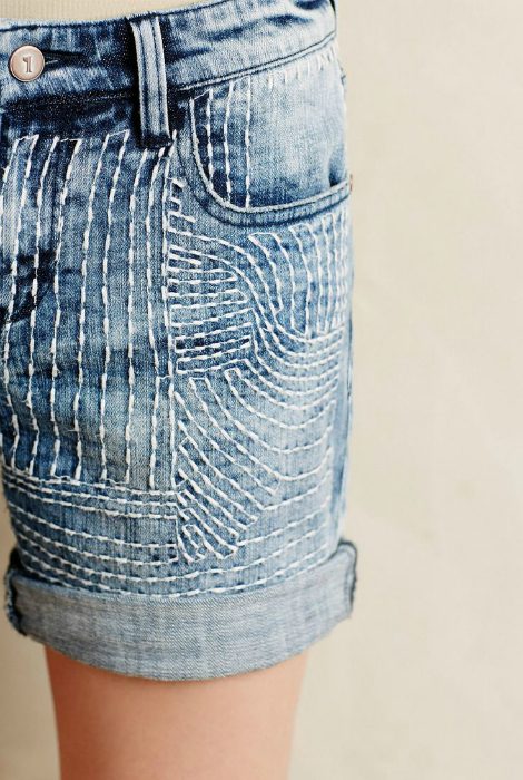 Сделайте из старой пары джинсов модные шорты с вышивкой. Нет-нет, речь совсем не идет о масштабных картинах, только простейшие стежки. Такие линейные узоры позволят превратить старые джинсы в стильную и уникальную вещь.