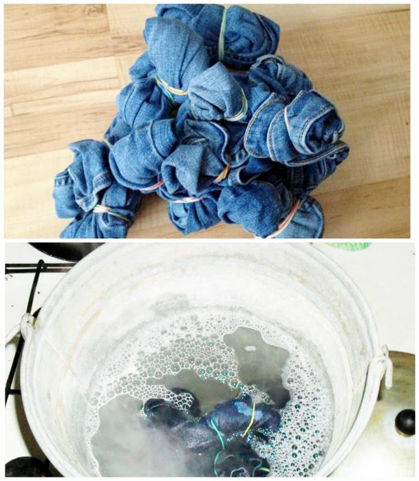 Джинсы-варенки снова в моде. Для создания таких джинсов понадобится хлорка, большая кастрюля или ведро и резинки для денег. Штанины джинсов нужно скрутить в жгуты и перетянуть резинками. Опустите брюки в кипящую воду с хлоркой и варите в течении 15-ти минут. После кипячения, джинсы нужно тщательно прополоскать, раскрутить и любоваться полученным эффектом.