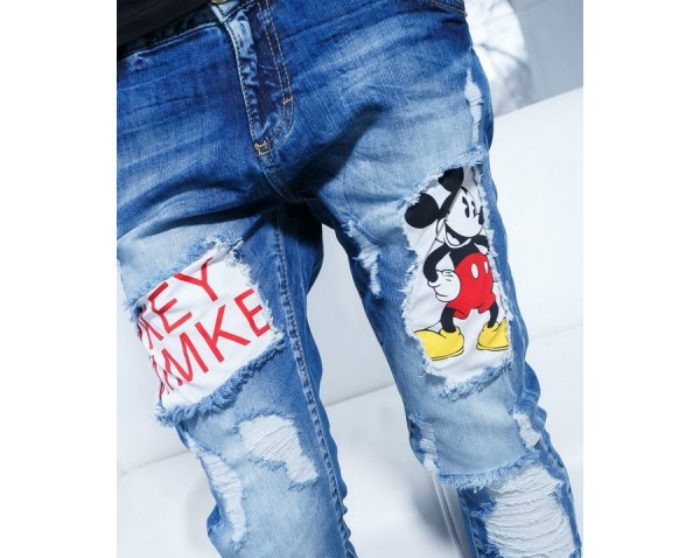 Еще один простейший способ трансформации любимых штанов. Для создания такого декора понадобится только небольшой трафарет с простым рисунком и немного краски для ткани.