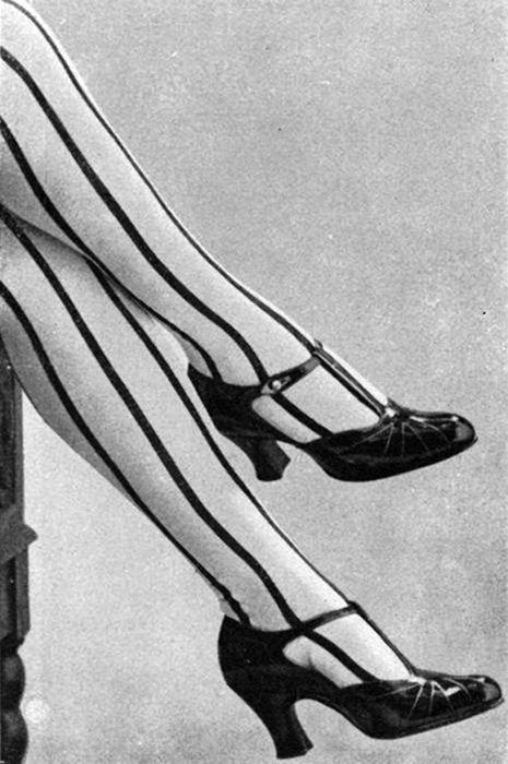 В 1920-е появляются материалы с металлическим отблеском, стразы и лакированные каблуки. Теперь обувь должна не только быть удобной, она должна привлекать к себе внимание, быть своеобразным акцентом в наряде девушки, достаточно женственным, но при этом подчеркивать ее независимость. В то же время девушки экспериментируют с разноцветными чулками, иногда совершенно замысловатыми и вычурными. Что ни сделаешь, лишь бы обратить на себя внимание!