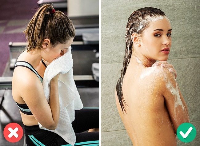 Души в спортзалах могут быть не самым комфортным местом на свете, но закупоренные поры, черные точки и прыщи, которые появляются, если вовремя не смыть с себя пот, определенно хуже. Не ленитесь брать банные принадлежности в спортзал и мыться сразу после того, как закончили тренировку.Внимательно следите за сигналами, которые посылает ваш организм
