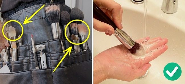 Кисти для макияжа при неправильном использовании могут стать причиной появления на коже раздражения, прыщей и других неприятностей. Чтобы этого избежать, кисточки, спонжики, аппликаторы и другие приспособления для макияжа нужно регулярно мыть. Для этого прекрасно подойдут обычные антибактериальные салфетки, а для глубокой чистки можно использовать деликатное моющее средство типа мягкого шампуня или пенки для умывания.