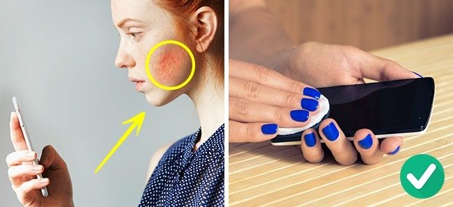 Когда-нибудь замечали у себя неприятную сыпь на щеках? Возможно, ее причина — мобильный телефон. Современные исследования доказали, что на этих девайсах содержится в десятки раз больше бактерий, чем на сиденье унитаза. Чтобы все эти полчища микробов не перекочевали на ваше лицо, возьмите себе за правило протирать экран телефона специальными очищающими салфетками.