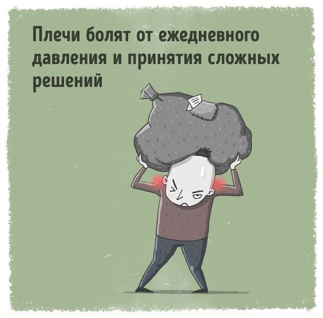 Боль в плечах говорит о том, что мы носим тяжёлую эмоциональную нагрузку, находимся под большим эмоциональным давлением. Возможно, кто-то в нашем окружении давит на нас. Или мы не можем принять важное решение, и оно лежит на наших плечах тяжким бременем.