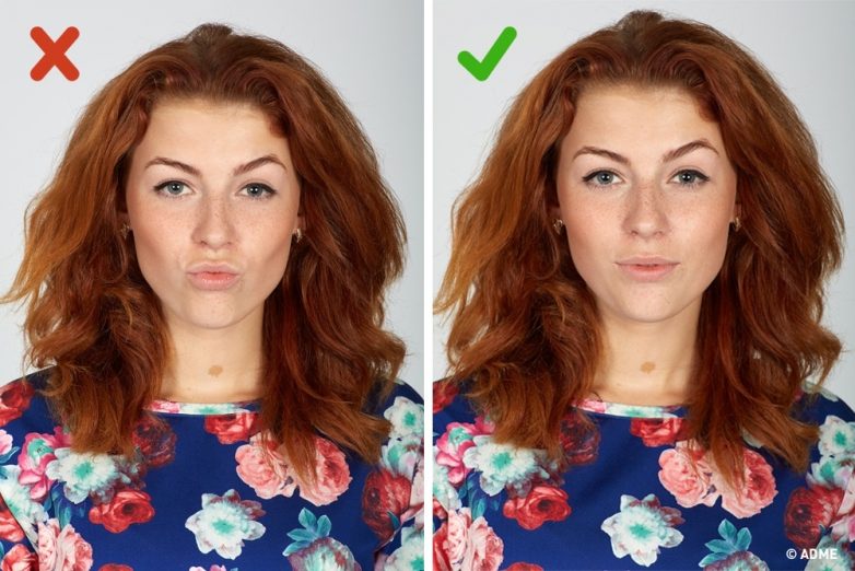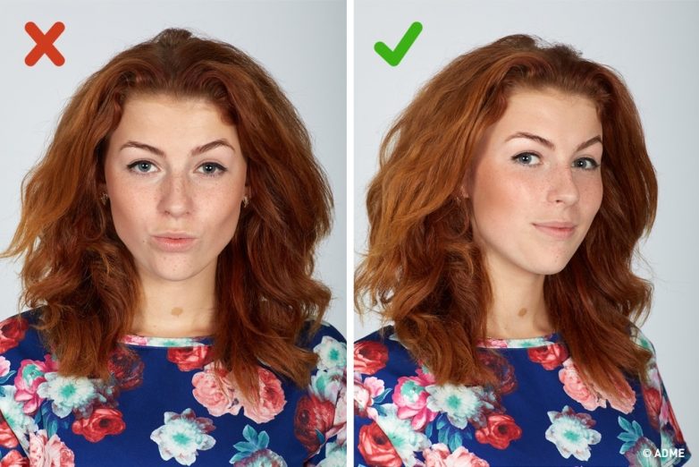 Почти у всех людей лица асимметричные. Поэтому решите для себя, какая сторона лица вам нравится больше, и поворачивайтесь к камере именно ею.Не втягивайте щеки