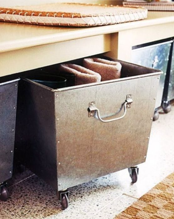 Удобно хранить обувь в небольших корзинах или ящиках на колёсиках, которые легко прячутся под стул или банкетку. Они мобильные, не занимают много места, вместительные и смотрятся эстетично.