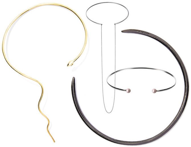 Незамкнутые колье оригинально смотрятся в разрезе рубашки и выгодно подчёркивают ключицы.