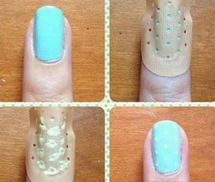 Совсем не умеете рисовать? Лейкопластырь вам в помощь. Приклейте кусочки перфорированного пластыря к ногтям, покрытым однотонным лаком и нанесите на него лак другого цвета. Очаровательный маникюр в горошек готов!