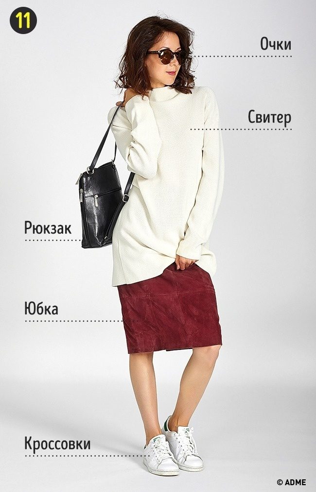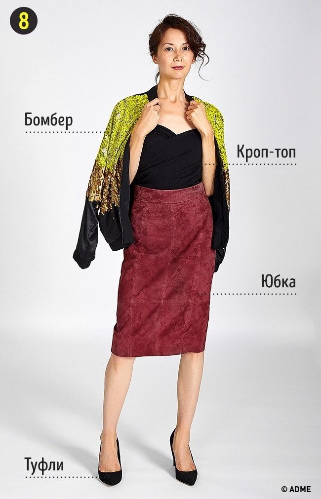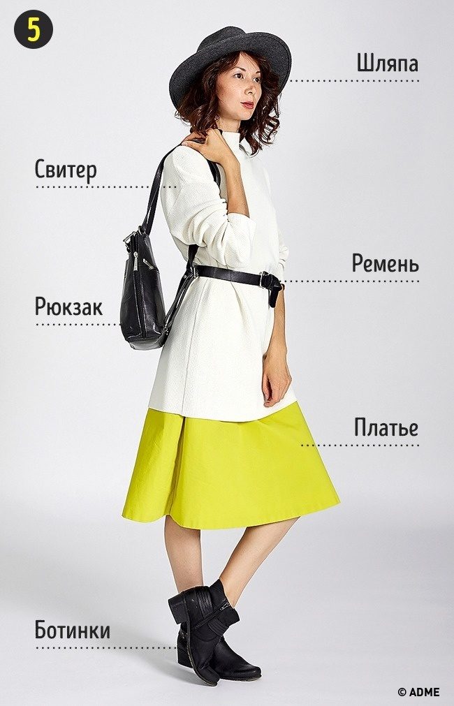 Чтобы показать вам, как правила воплощаются в дело, мы собрали яркую повседневную капсулу. Она состоит из базовых предметов одежды и разбавлена трендовыми вещами.Мы использовали 8 предметов гардероба: пальто, свитер, бомбер, платье, джинсы, кроп-топ, юбка и рубашка.