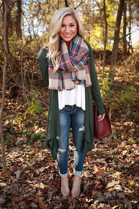 Синие джинсы, зелёный кардиган, шарф в крупную цветную клетку – самое то, чтобы освежиться в осенний день. Крутым и стильным акцентом станет сумка насыщенного оттенка, в этом случае бордового, который отлично подходит для бархатного сезона.