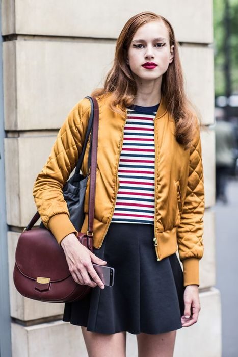 В этом году модно носить одежду их эпох 80-х и 90-х. Расклешённая юбка мини, полосатый свитшот, спортивная крутка горчичного оттенка – стопроцентное попадание в модную мишень!