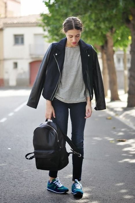 Удобство и практичность стоят на первом месте при выборе одежды для студентки. Кожаная косуха, прилегающие джинсы, стильный свитшот, комфортная обувь и вместительный рюкзак. Пожалуй, ежедневный образ готов!