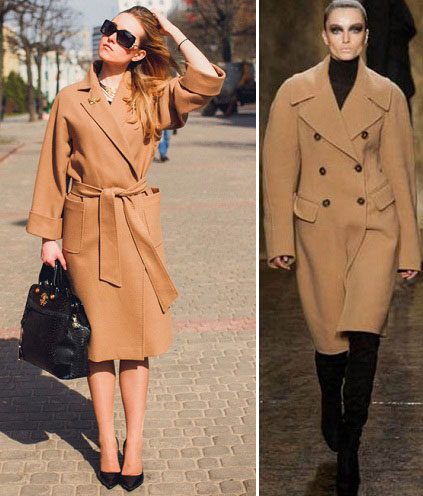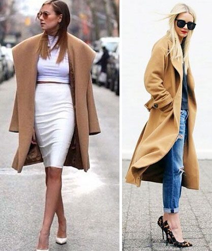 Также с этой точки зрения будет очень неплохо выглядеть пальто-оверсайз. Дело в том, что этот фасон сейчас в моде, а оттенок кэмел сделает его ещё более привлекательным. Носить его можно с той же самой одеждой, что и примеры выше, но делая основной упор на её повседневный вид. Всё, что останется – это добавить несколько модных аксессуаров, но об этом чуть ниже.