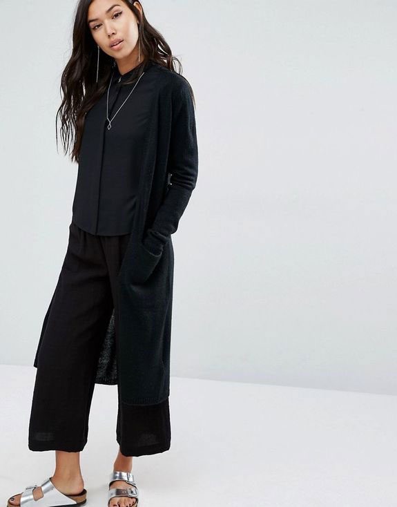 Тёплой осенью длинный кардиган будет отлично смотреться с широкими брюками-кюлотами и обувью на плоском ходу, а цветной монолук добавит образу элегантности.