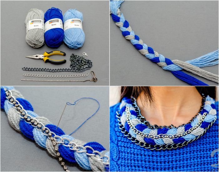 Из остатков шерстяной пряжи и фурнитуры можно смастерить очаровательное колье. Такое украшение можно пришить к воротнику вязаного свитера или носить с любым другим нарядом, как самостоятельный аксессуар.