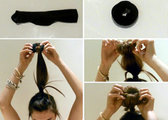 Прически с пучками — один из трендов этого сезона. Однако, подобные прически из тонких редких волос выглядят довольно печально. Сделать модный пышный пучок поможет обычный носок, скрученный в тугой валик.