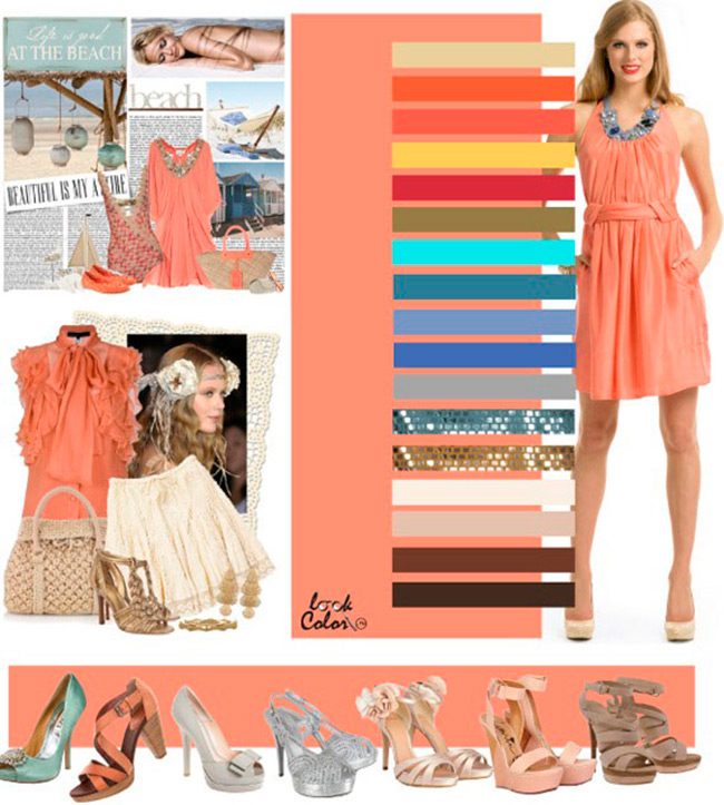 Сложный, мягкий, заботливый цвет. Он вроде бы и тёплый, и вроде бы холодный. С ним прекрасно сочетаются блестящие вещи расшитые пайетками, бисером. Цвет праздничный, но не навязчивый. В этом цвете не захочется нервничать, ведь он сам олицетворяет отдых. Если вы хотите, что бы вас считали счастливой и умиротворённой (когда притворяешься, начинаешь верить, а вера творит чудеса), то этот цвет для вас.Какой цвет сочетается с коралловым розово-персиковым цветом? Такие же мягкие и уютные. Песочный, морковный, коралловый розово-оранжевый, мягкий солнечный, приглушенно-малиновый, оливковый, лазурный, джинсовый, гиацинтовый, королевский синий, серый, серебро, золото, бело-бежевый, бежевый, коричневый, тёмно-коричневый.