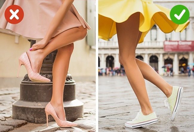 На шпильках по брусчатке во время путешествия или в коктейльном платье на работу. Цена и бренд не важны, это просто не к месту и не по случаю. В конце концов, это неудобно. Будет полезно узнать дресс-код и формат мероприятия заранее. Не стоит позволять желанию поскорее «выгулять» очередную обновку возобладать над здравым смыслом.