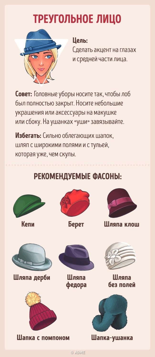Предлагаем простую и понятную инфографику, которая поможет выбрать идеальный берет, шапочку или шляпу в соответствии с формой лица.