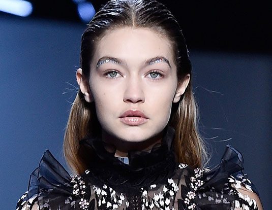 Очень необычный макияж бровей можно подсмотреть на показе Giambattista Valli. Под бровью Джиджи Хадид проложена дорожка глиттера. Просто восхитительно!