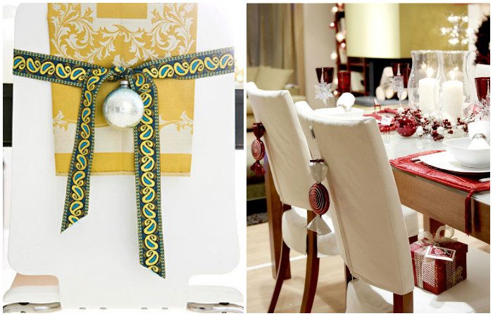 Стулья с полным отсутствием декора рядом с украшенным столом будут выглядеть немного странно. Поэтому не забудьте украсить их хотя бы парой ярких лент и новогодних шаров. По-настоящему праздничный вид стульям придадут съемные текстильные чехлы. Можно приобрести готовые чехлы или сделать их самостоятельно – это займет немного времени даже у новичка в шитье.