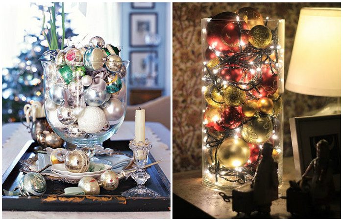 Выбрасывать новогодние игрушки, которые уже отслужили свое, но с которыми связаны приятные воспоминания – занятие довольно печальное. Чтобы не испортить праздничное настроение, подарите им вторую жизнь. Просто сложите игрушки в стеклянные вазы или банки и расставьте этот необычный декор по видным местам. Свободное пространство между игрушками можно заполнить блестящей мишурой или гирляндами.