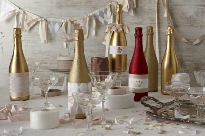 Сверкающий декор легко создает праздничное настроение. Для украшения бутылок используйте фольгу или блестки, приклеенные к стеклу.
